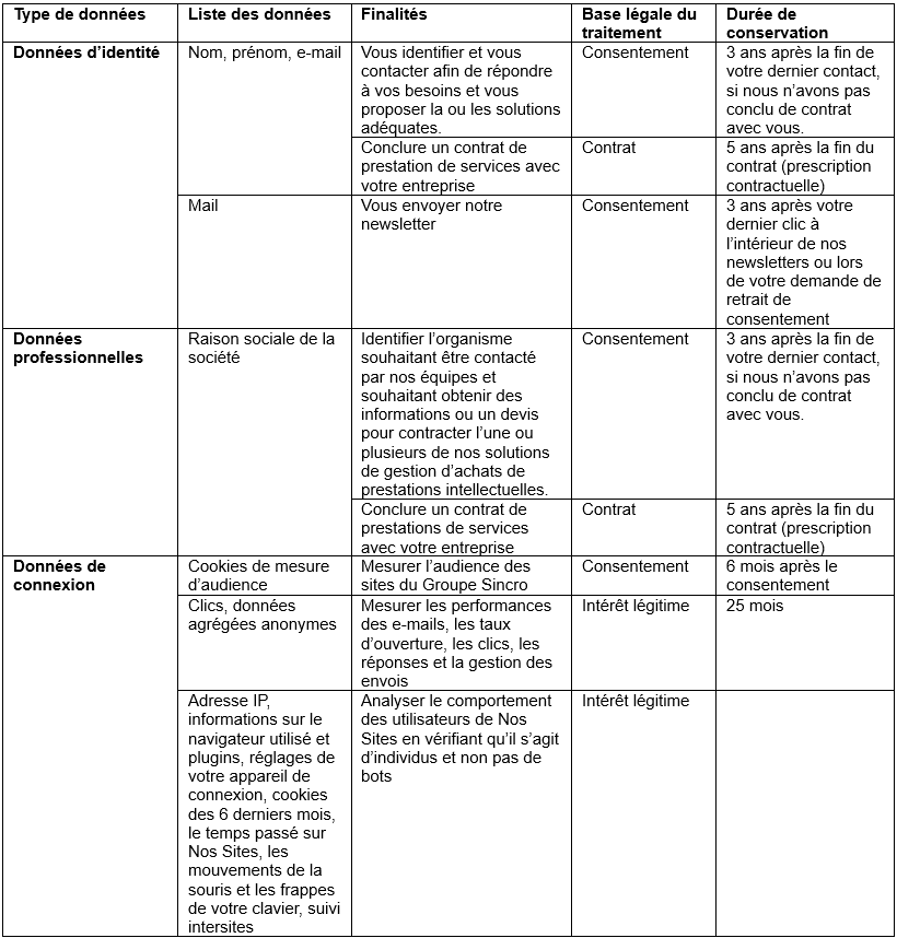 Tout traitement de données réalisé par le Groupe Sincro poursuit une finalité précise, est fondé sur une base légale de traitement, ce qui nous permet de conserver vos données pendant des durées de conservation légales, définies par les différentes lois sectorielles françaises.
