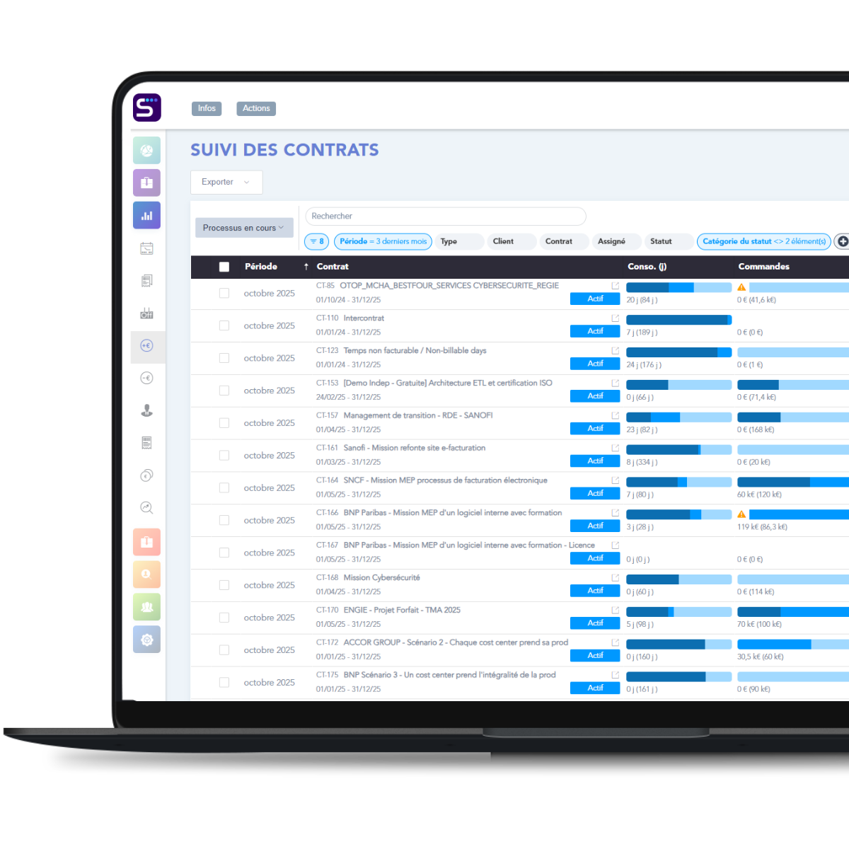 Notre solide expérience auprès des grands comptes et des ESN en croissance nous a permis de concevoir un outil répondant pleinement aux enjeux de pilotage, de rentabilité et de conformité. La plateforme prend ainsi la position d’un véritable hub central. Missions, prestataires, achats, facturation, reporting… tout est consolidable. Vous gagnerez ainsi en visibilité, sécuriserez vos flux financiers et soutiendrez vos décisions stratégiques sur le long terme.
